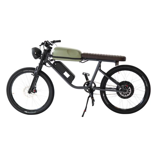 Tops out at around 28 mph with a range of around 40 miles. I dig the WWII service bike look…